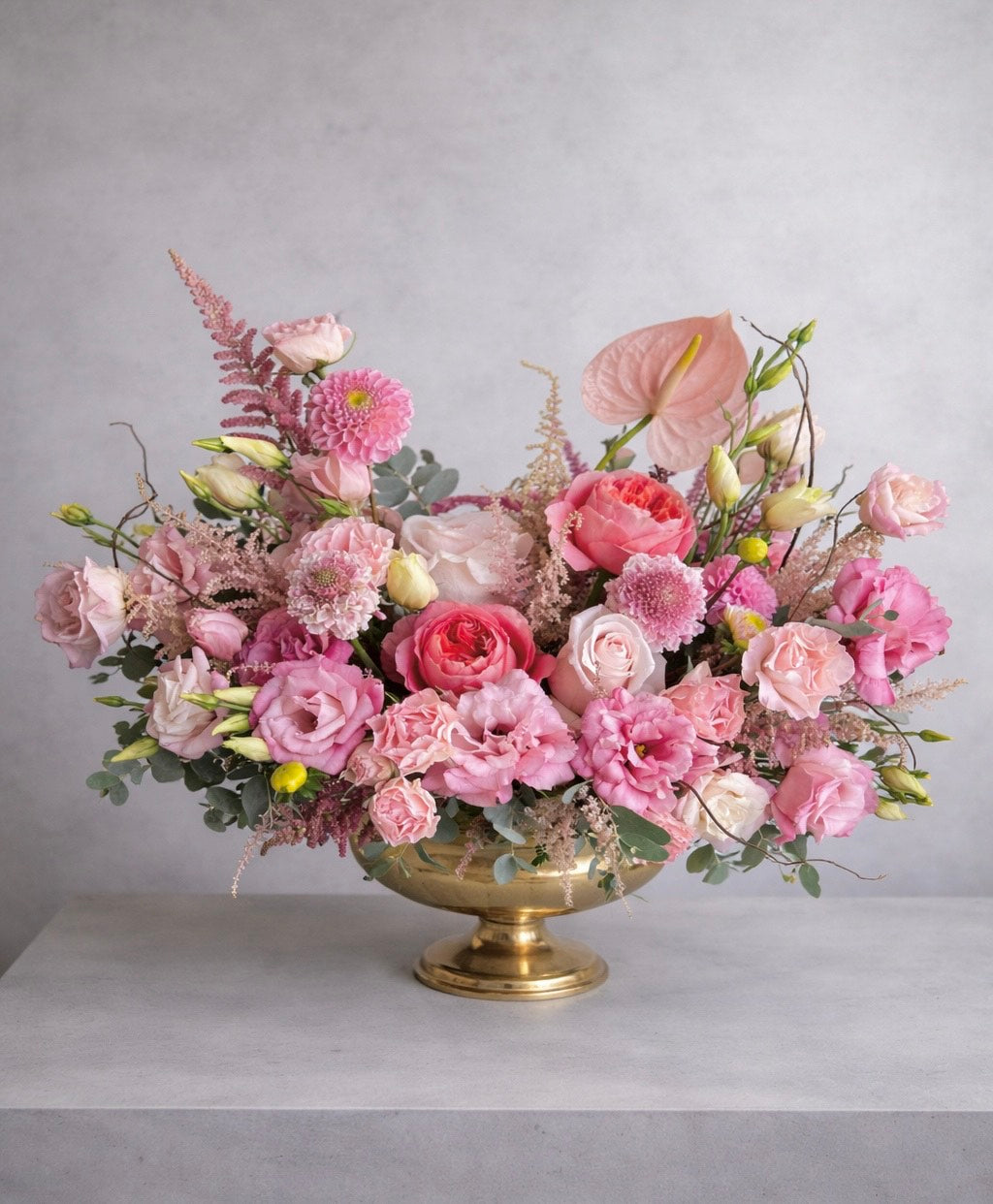 Belle features soft blush roses, lisianthus, and carnations arranged in harmonious shades of pink and nude. Designed in a refined gold vase, this composition brings warmth, elegance, and understated luxury to any space.