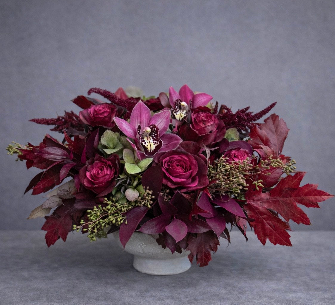 This arrangement features premium burgundy roses, orchids, textured autumn greenery, and seasonal botanical accents.