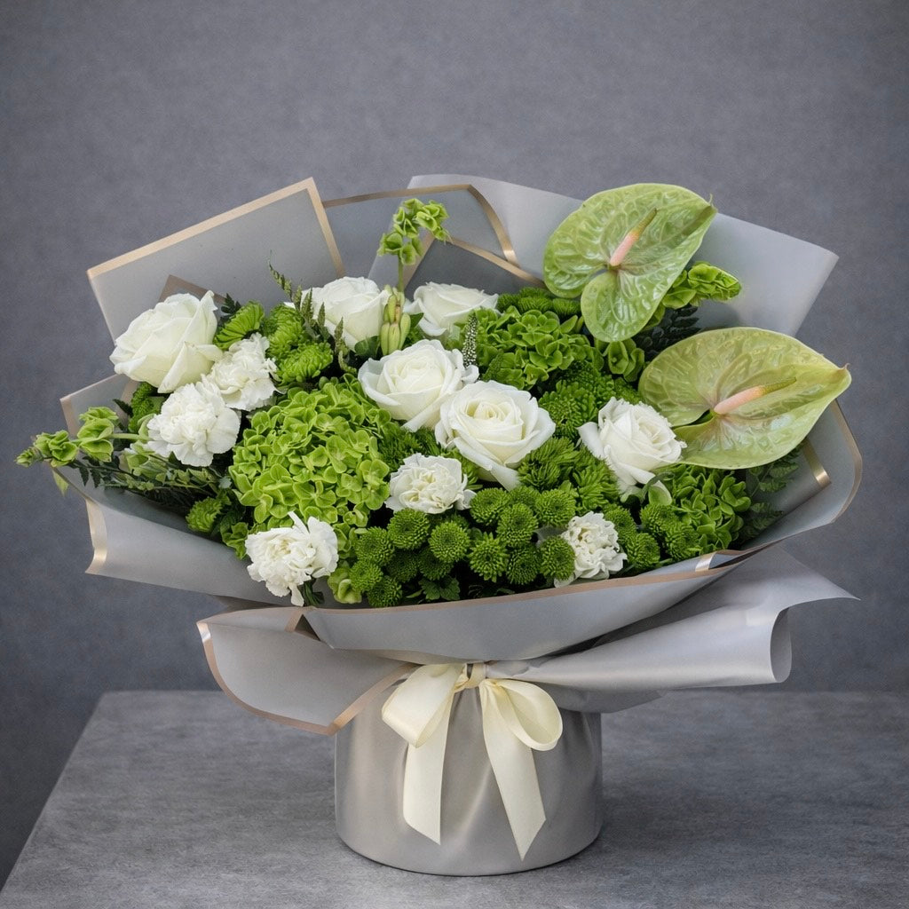 Wrapped in stylish grey paper with subtle golden accents and finished with a satin ribbon, this bouquet feels light, refined, and effortlessly chic. The harmonious blend of white and green tones brings a sense of calm, freshness, and sophistication to any space.