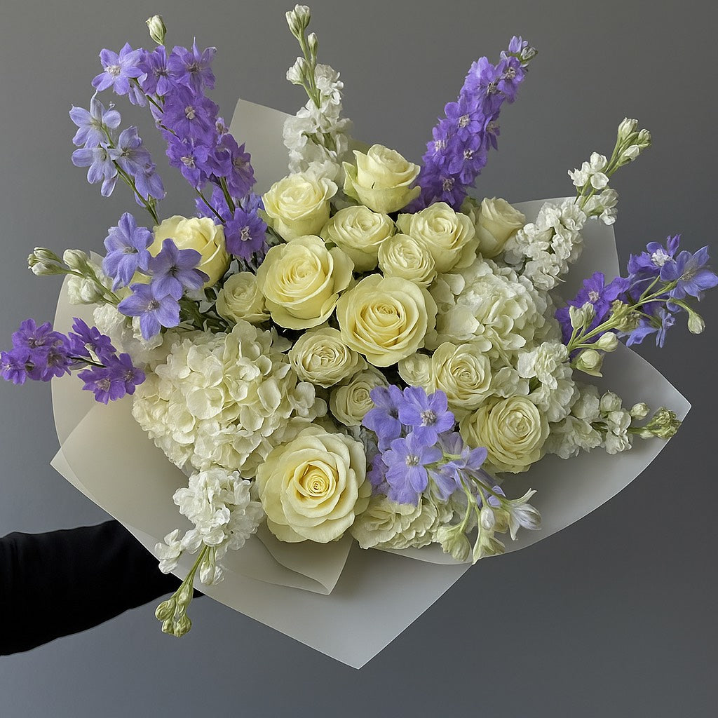 Lavender Grace is a graceful and refined bouquet featuring soft ivory roses, lush hydrangeas, and delicate white blooms, beautifully accented with vibrant lavender delphiniums.